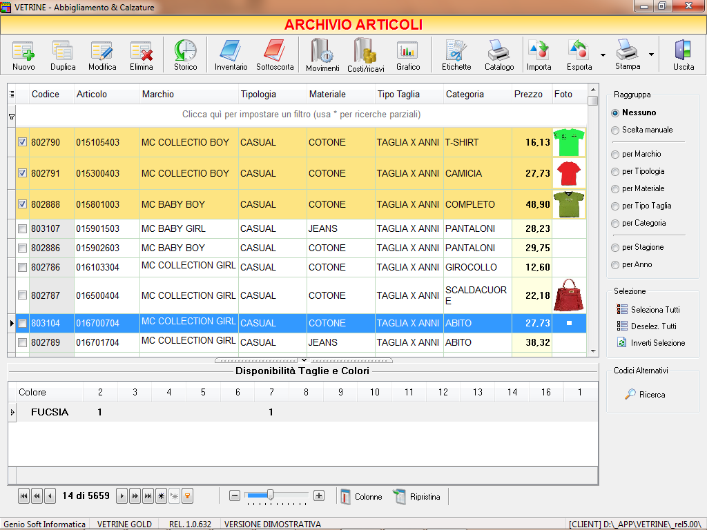 | Visualizzazione e gestione delle giacenze per taglia e colore | Possibilità di abilitare una password per l'accesso al programma |